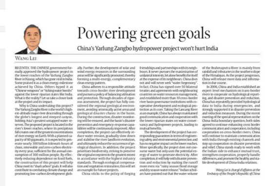 2 、2025年1月23日,驻印度使馆临时代办王雷在印主流英文报纸《印度快报》发表题为《助力绿色目标—雅鲁藏布江下游水电工程不会伤害印度》的署名文章